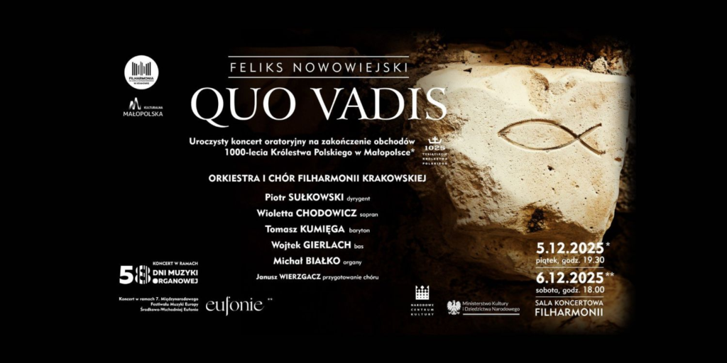 – wyjątkowy koncert oratoryjny – prezentację niezwykłego dzieła Feliksa Nowowiejskiego „Quo vadis”. Tuż po swej premierze ponad 100 lat temu, zainspirowane powieścią Sienkiewicza oratorium odnosiło spektakularny sukces i święciło triumfy na około dwustu scenach na całym świecie. Teraz po latach zapomnienia wróci na specjalnym koncercie. poprowadzone przez dyrektora Opery Krakowskiej – Piotra Sułkowskiego. Na estradzie wystąpią Orkiestra i Chór Filharmonii Krakowskiej pod batutą Piotra Sułkowskiego oraz solistki i soliści: Wioletta Chodowicz jako Ligia, Wojtek Gierlach w partii Dowódcy Pretorian oraz Tomasz Kumiega jako Kapłan. Partie organowe wykona Michał Białko.