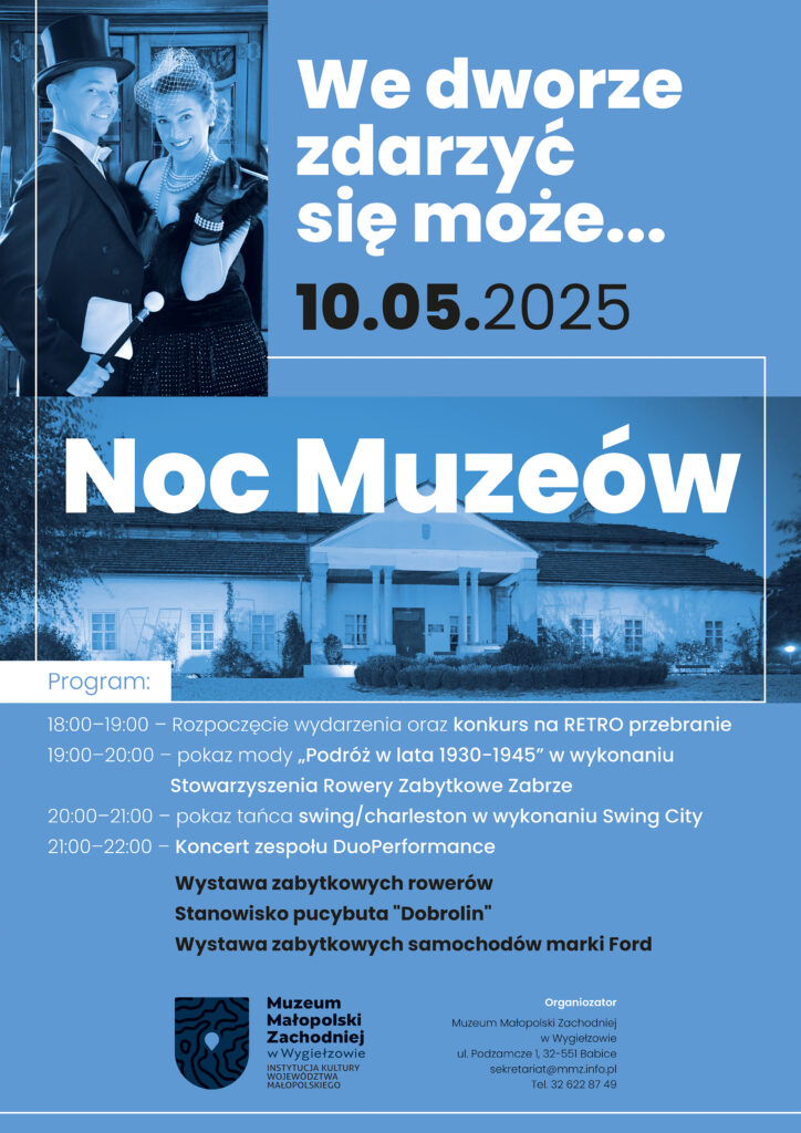 Muzeum Małopolski Zachodniej w Wygiełzowie zaprasza na Noc Muzeów pt. „We dworze zdarzyć się może …”. Podczas wydarzenia, organizowanego w Dworze z Drogini, będzie można przenieść się w czasy dwudziestolecia międzywojennego i poczuć niezwykły klimat tamtej epoki. Wśród atrakcji m.in. pokaz mody w wykonaniu Stowarzyszenia Rowery Zabytkowe Zabrze, wystawa zabytkowych rowerów, konkurs na retro-przebranie i koncert zespołu DuoPerfomance.