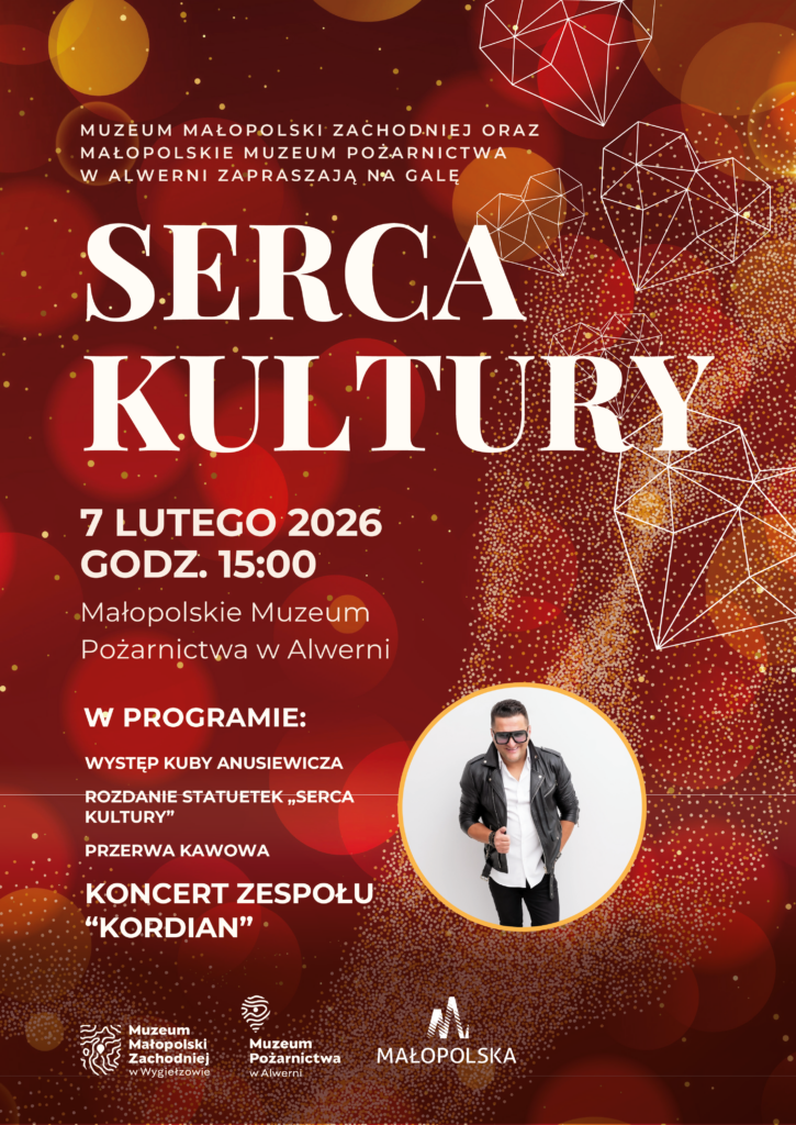 Muzeum Małopolski Zachodniej w Wygiełzowie w swojej filii – Małopolskim Muzeum Pożarnictwa w Alwerni organizuje drugą Galę „Serca Kultury”. Jest to wyjątkowe wydarzenie poświęcone uhonorowaniu osób, instytucji oraz organizacji, które w szczególny sposób przyczyniają się do rozwoju i popularyzacji kultury na terenie Małopolski Zachodniej. Podczas tegorocznej edycji nie zabraknie akcentów muzycznych. Na scenie wystąpią: uczestnik „The Voice of Poland” Kuba Anusiewicz oraz łączący góralski folklor, disco oraz pop-rocka zespół Kordian.
