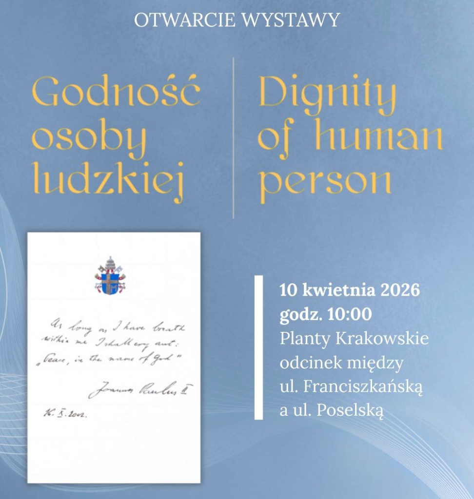 Instytut Dialogu Międzykulturowego im. Jana Pawła II w Krakowie inauguruje nową wystawę plenerową na Plantach Krakowskich. Ekspozycja „Godność osoby ludzkiej” będzie okazją do podziwiania wyjątkowych fotografii, jak również przypomnienia słów św. Jana Pawła II i Jego nauczania o godności osoby ludzkiej. Wystawa powstała z myślą o upamiętnieniu 40. rocznicy wizyty Papieża Polaka w rzymskiej Synagodze Wielkiej oraz 40. rocznicy Jego wspólnych modlitw o pokój w Asyżu z przedstawicielami wielu światowych religii.