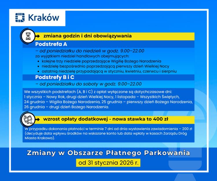 Wzrośnie wysokość opłaty dodatkowej – nowa stawka wyniesie 400 zł. W przypadku uregulowania należności w terminie 7 dni od dnia wystawienia zawiadomienia opłata zostanie obniżona do 200 zł. Co ważne, decydująca nie jest tu data nadania przelewu, a data wpływu środków na wskazane konto lub data wpłaty w kasach Zarządu Dróg Miasta Krakowa.
