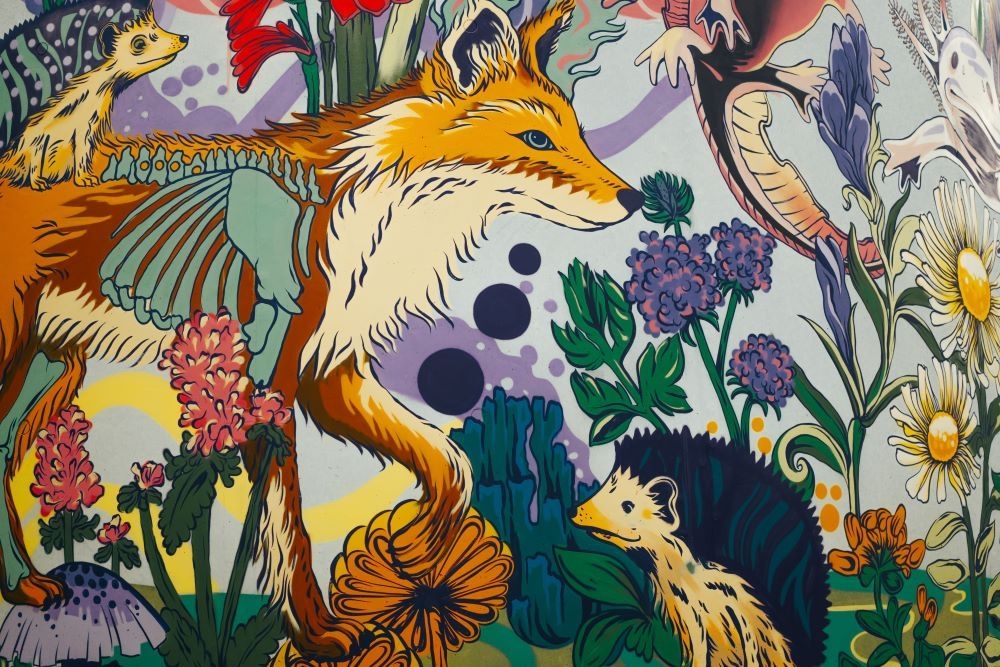 Pierwszy z murali, zatytułowany „Dżungla przyszłości”, skłania do refleksji nad ewolucją i wpływem urbanizacji na przyrodę. Projekt zawiera liczne elementy, które zaskakują swoją symboliką i zachęcają do zadawania pytań. Podsuwamy kilka tropów które mogą służyć dalszej analizie: