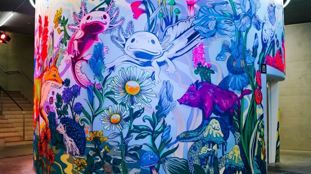 Mural ten wyróżnia się zastosowaniem farb UV oraz specjalistycznym oświetleniem, które tworzy unikatowy efekt graficznego teatru. Wykorzystanie nowoczesnej technologii sprawia, że „Dżungla przyszłości” to nie tylko dzieło sztuki, ale również multisensoryczne doświadczenie.