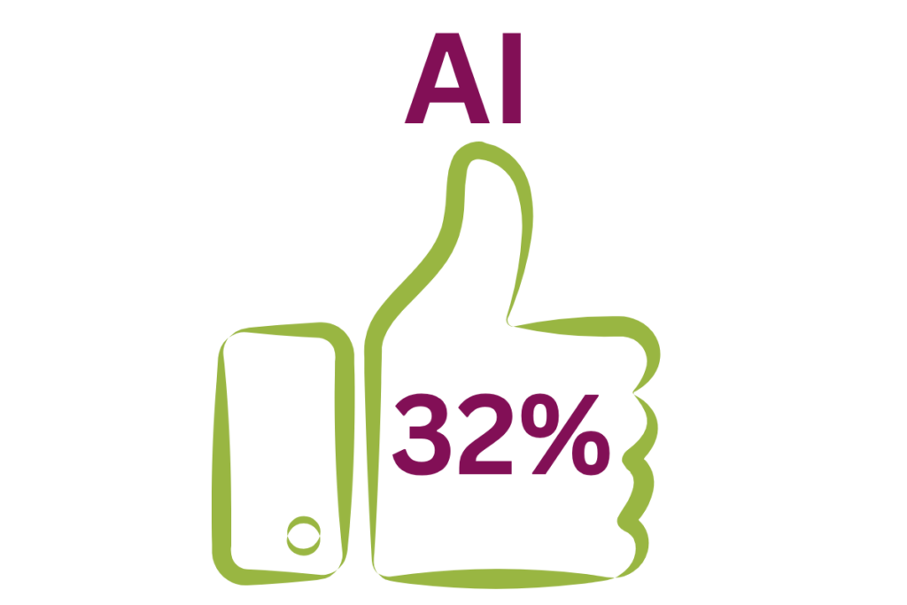 32% badanych podmiotów zadeklarowało wykorzystanie – w trakcie ostatnich 12 miesięcy – programów i aplikacji, opartych na AI, aby usprawnić działanie przedsiębiorstwa bądź zwiększyć efektywność bieżących zadań.
