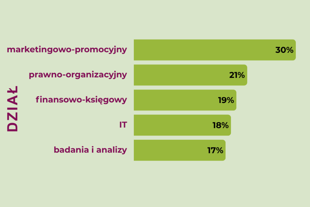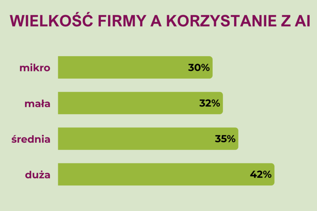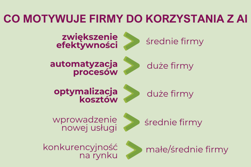 Duże podmioty dominują w przypadku działu marketingu, finansów i księgowości czy sprzedaży. Z kolei firmy mikro i małe najczęściej używają AI w działach zajmujących się obsługą klienta. Główną motywacją wskazaną przez 70b % badanych było zwiększenie efektywności. Na drugim miejscu wymieniano automatyzację procesów (35 %), a na kolejnym – optymalizację kosztów (27 %).