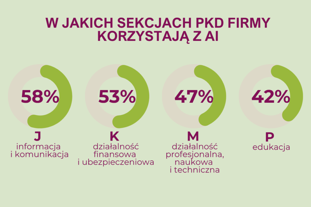 Najwięcej deklaracji potwierdzających korzystanie z narzędzi AI otrzymano od podmiotów z sekcji: J (informacja i komunikacja), K (działalność finansowa i ubezpieczeniowa), M (działalność profesjonalna, naukowa i techniczna) oraz P (edukacja).