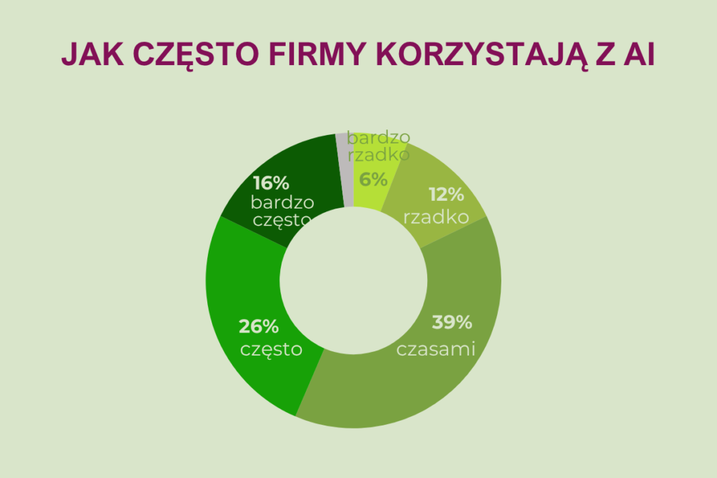 42 % przedsiębiorstw deklarujących korzystanie z narzędzi opartych na sztucznej inteligencji robiło to często lub bardzo często w ciągu ostatnich 12 miesięcy. Najczęściej padały jednak odpowiedzi czasami lub rzadko.
