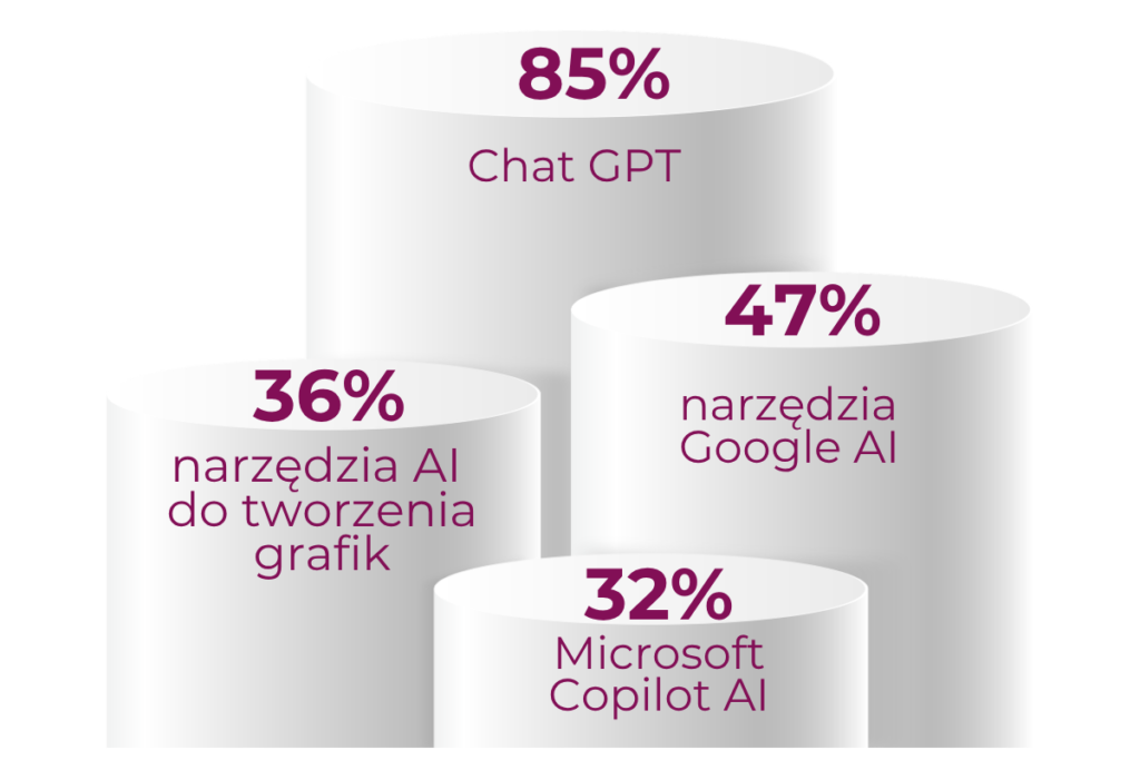 Niemal połowa badanych przedsiębiorców, wspierających się na AI wykorzystuje narzędzia Google AI. W czołówce znalazły się też narzędzia do tworzenia grafik (Canva AI), Microsoft Copilot AI oraz chatboty.