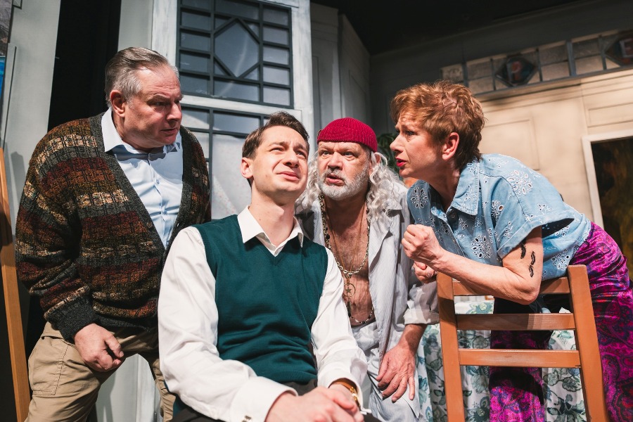 Od lewej: Robert Chodur (Eugeniusz), Maciej Kokot (Artur), Marek Kępiński (Stomil), Eleonora (Małgorzata Machowska). Fot. Wiktoria Cieśla/Teatr im. Wandy Siemaszkowej