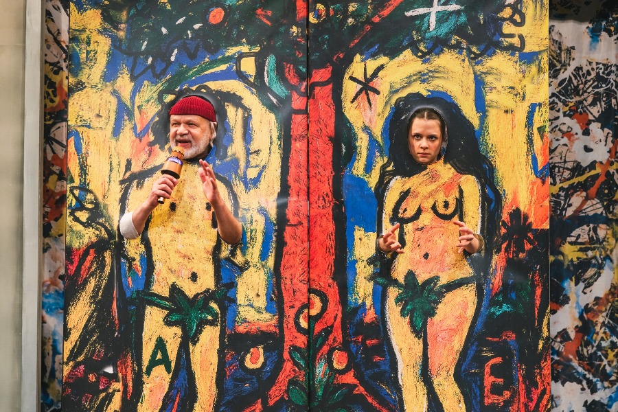 Babcia Eugenia (Anna Demczuk) nie ma nic z powagi i dobroduszności nestorki rodu, bo woli „rżnąć” w karty i dobrze się bawić. Stomil (Marek Kępiński) snuje się w hipisowskich stylówkach i realizuje kolejne, banalne performanse. Wyzwolona, a właściwie znudzona Eleonora (Małgorzata Machowska), by poczuć namiastkę ekscytacji, romansuje z prymitywnym chamem Edkiem (Stanisław Twaróg). Wuj Eugeniusz (Robert Chodur) to figura rodem PRL-u, perfekcyjny konformista, gdy trzeba konserwatysta, ale wystarczy zmiana wiatru historii i oto mamy gorliwego orędownika tępej, autorytarnej władzy. Nowe, lepsze ma nadejść z Arturem (Maciej Kokot), który niczym bohater romantyczny walczy o powrót świata wartości. Desperacko łaknie jakiejkolwiek idei. Ale w tym buncie przeciwko wykoślawionemu liberalizmowi więcej jest pozy niż działania. Jest jeszcze Ala (Joanna Sokołowska), najbardziej prawdziwa w tym towarzystwie, epatująca młodością i seksualnością, ale gruncie rzeczy postać tragiczna. W tym ultraliberalnym, a jednocześnie zatęchłym świecie cyfrowej przyszłości pragnie czegoś autentycznego, choćby miłości, ale happy endu nie będzie. Świetne są jej dialogi z Arturem, gdy on mówi rozbudowanymi zdaniami wielokrotnie złożonymi, a ona slangiem, który powstaje na styku Internetu, popkultury i mediów społecznościowych.