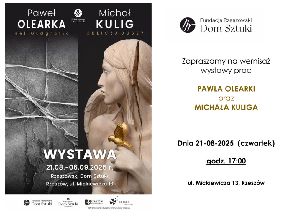 Fotografia i rzeźba na dobre rozgoszczą się od czwartku, 21 sierpnia w Rzeszowskim Domu Sztuki. O godz. 17.00 wernisaż wystawy prac Pawła Olearki „HeliOLOgrafia” oraz Michała Kuliga „Oblicza Duszy”. Zapowiada się piękny artystyczny dialog między dwoma rzeszowianami z perspektywy młodości i młodej dojrzałości. Kuratorką wystawy jest Beata Kuman, znana rzeszowska historyczka sztuki na co dzień związana z Muzeum Okręgowym w Rzeszowie.