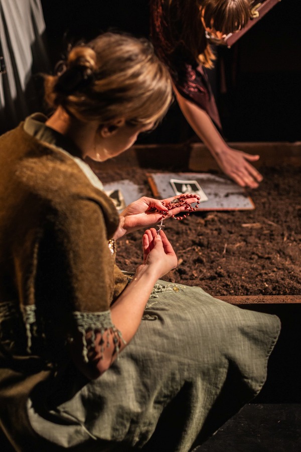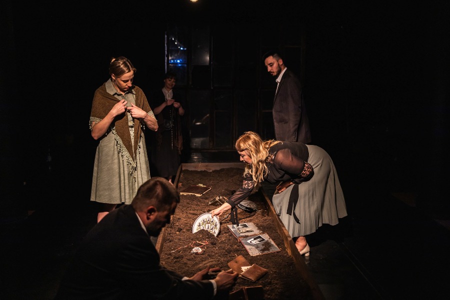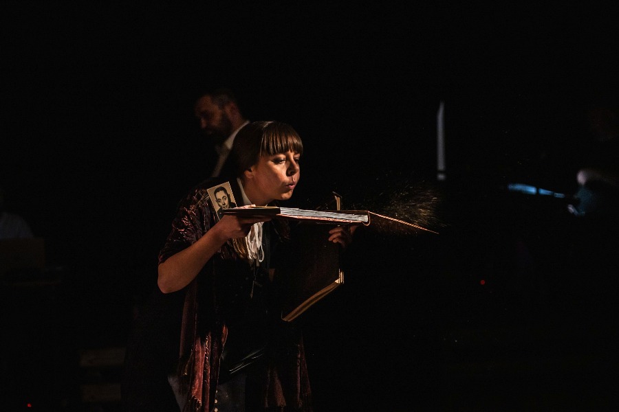 Ale tamta przeszłość, choć zapomniana, nie jest niema. Ona przemawia, wyziera z mijanych uliczek, ocalałych kamienic, przykurzonych czarno-białych fotografii, tak dawno nie śpiewanych piosenek, omszałych płyt nagrobnych. Wystarczy chcieć dostrzec tradycję, która przez wieki współtworzyła to miasto. Czytać znaki, jak te, które pojawiają się w „Księdze powrotu” – na środku sceny wielka skrzynia wypełniona ziemią a w niej: sfatygowany portfel, stara fotografia, różaniec, zardzewiała lampa kolejowa i inne pamiątki przeszłości. Ta skrzynia staje się też świadkiem jednej z najbardziej wstrząsających scen, gdy bezimienna ciotka Anety Adamskiej-Szukały, piękna siostra dziadka, o której nikt już nic nie pamiętał, odzyskuje imię, twarz i tożsamość. Aneta wcieliła się w postać ciotki Marianny, laborantki w czasie II wojny światowej pracującej w aptece, która za pomoc żołnierzom Armii Krajowej trafiła do Auschwitz, gdzie zginęła. W „Księdze powrotu” Marianna doczekała się symbolicznego pogrzebu, ale gdy patrzymy, jak kolejne grudki ziemi spadają na Anetę, ogarnia nas paraliżujące wzruszenie.