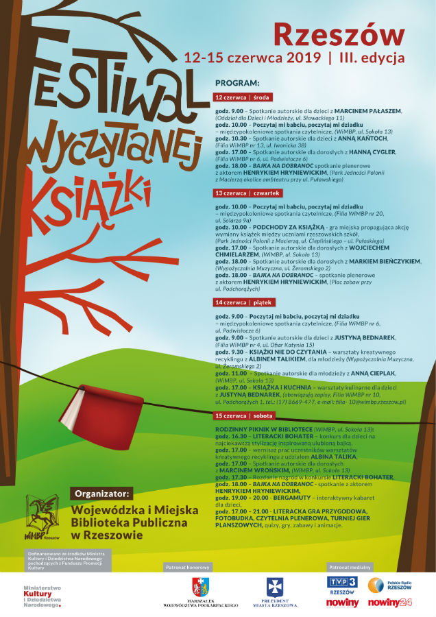 Warsztaty kulinarne dla dzieci z Justyną Bednarek, tworzenie dzieł sztuki ze zniszczonych książek, wielki rodzinny piknik przed biblioteką przy ul. Sokoła, wieczorne głośne czytanie bajek w rzeszowskich parkach, a jako wisienka na torcie – kabaret dla dzieci w wykonaniu krakowskich aktorów. Do tego wiele spotkań z autorami książek: Wojciechem Chmielarzem, Anną Cieplak, Markiem Bieńczykiem, Hanną Cygler oraz Marcinem Wrońskim. Wszystko od 12 do 15 czerwca br. w ramach III Festiwalu Wyczytanej Książki, który organizuje Wojewódzka i Miejska Biblioteka Publiczna w Rzeszowie.