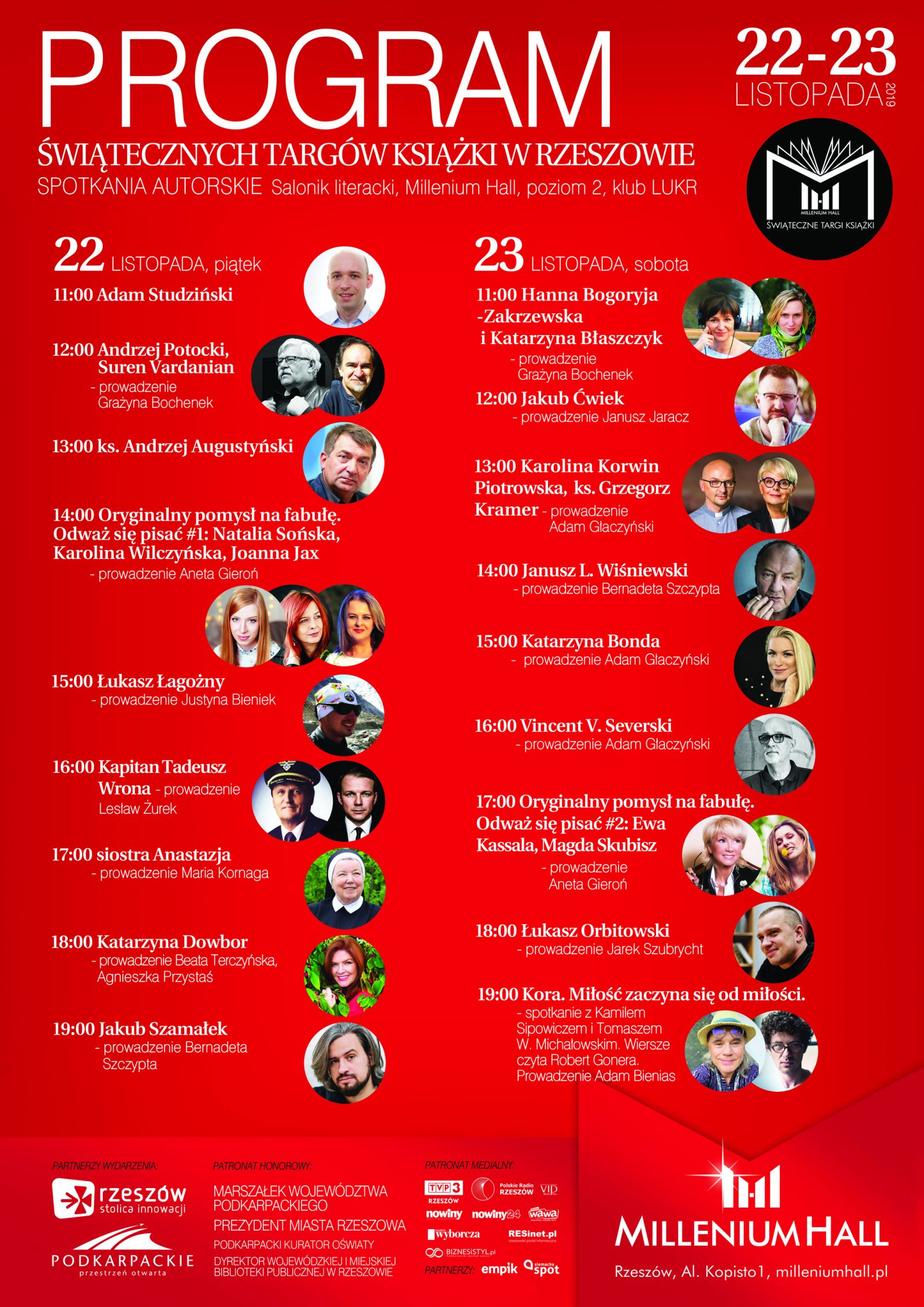 Trzecia już edycja Świątecznych Targów Książki trwa od piątku w Rzeszowie – w Galerii Millenium Hall niepodzielnie rządzą książki. Na stoiskach trzydziestu wydawnictw kłębi się tłum moli książkowych, a równie liczne audytorium przyciągają spotkania autorskie z ulubionymi pisarzami w Klubie LUKR. W piątek o swoich bohaterach opowiadali m.in. Andrzej Potocki, Natalia Sońska, Joanna Jax i Karolina Wilczyńska. Wspomnieniom nie było końca z kapitanem Tadeuszem Wroną oraz Katarzyną Dowbor, zaś siostra Anastazja zdradziła tajemnice swojej legendarnej kuchni. W sobotę drugi dzień targów i kolejne spotkania autorskie. Będą: Katarzyna Bonda, Leon Wiśniewski, Łukasz Orbitowski oraz Magda Skubisz. Kamil Sipowicz i Tomasz Michałowski opowiedzą o kulisach książki „Miłość zaczyna się od miłości” i odkryją, jak Kora pracowała nad tekstami piosenek, jak tworzyła nowe wersje, jak skreślała, uzupełniała, walczyła o frazę i rytm…