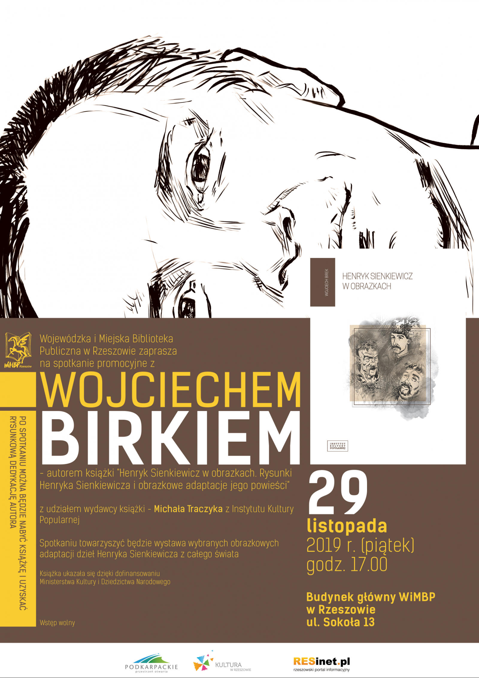 Spotkanie autorskie z Wojciechem Birkiem, podczas którego będzie można kupić książkę i uzyskać rysunkową dedykację autora, zaplanowano na piątek, 29 listopada w rzeszowskiej bibliotece przy ul. Sokoła 13. Wydarzenie rozpocznie się o godz. 17. Uświetni je wystawa wybranych obrazkowych adaptacji dzieł Henryka Sienkiewicza z całego świata.