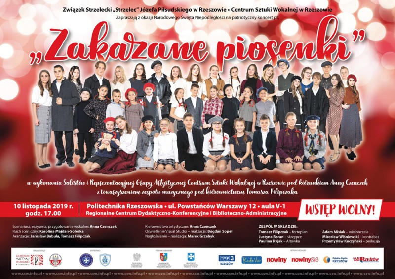 Związek Strzelecki „Strzelec” oraz Centrum Sztuki Wokalnej w Rzeszowie zapraszają na patriotyczny koncert „Zakazane piosenki”, który odbędzie się w niedzielę, 10 listopada na Politechnice Rzeszowskiej. Młodzi artyści wykonają zarówno pieśni żołnierskie, jak i te upamiętniające antyniemiecką i partyzancką twórczość muzyczną podczas II wojny światowej. Usłyszymy pieśni wojskowe, legionowe, a także utwory z filmu „Zakazane piosenki” w reżyserii Leonarda Buczkowskiego. Na scenie wybrzmi legendarna „Siekiera, motyka” czy „Warszawo ma”.