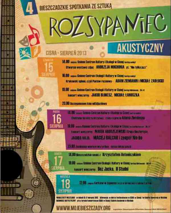 Każdego roku w okolicach sierpniowego święta Matki Boski Zielnej z Bieszczad płynie zaproszenie na Rozsypaniec. Ale nie na jeden z najpiękniejszych szczytów tych gór, lecz spotkania ze sztuką. To wyjątkowe wydarzenie, ponieważ jego ideą jest łączyć, a nie dzielić, więc w jednym miejscu z najróżniejszych dziedzin sztuki tworzy się niepowtarzalną całość. Przez cztery dni i cztery noce w Bieszczadach w jednym miejscu rozbrzmiewają dźwięki muzyki poetyckiej, folkowej, turystycznej, można oglądać wystawy fotograficzne, uczestniczyć w konkursach i warsztatach artystycznych i przede wszystkim spotkać się z artystami i podróżnikami. W tym roku na „Rozsypańcu” wystąpi m.in. Maciej Balcar z zespołem „Nie-bo”, grupa Bez Jacka i Marek Andrzejewski z reaktywowaną „Grupą Niesfornych”, a w pojedynku na słowa i wiersze zmierzą się Adam Ziemianin, dobry duch festiwalu, i Michał „Cicho Sza” Zabłocki.