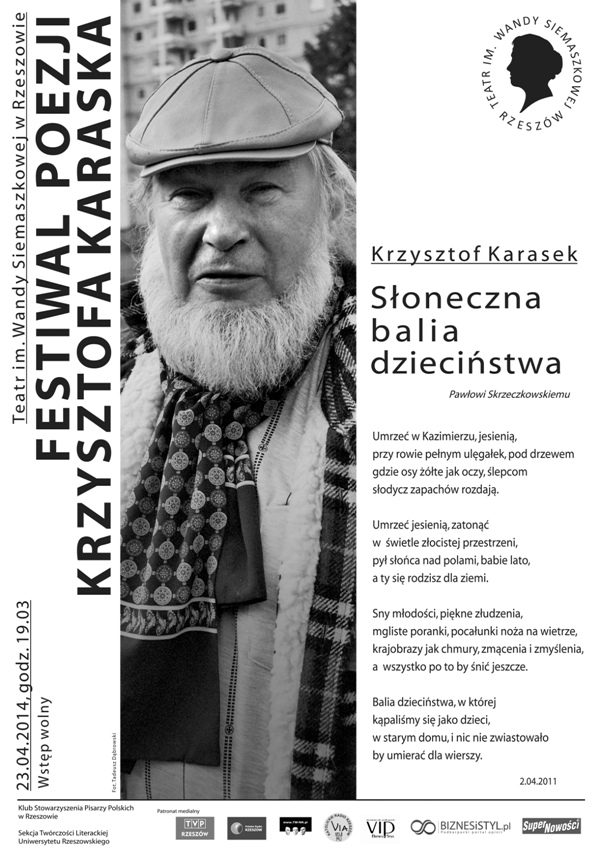Zbigniew Herbert uważał Krzysztofa Karaska za najwybitniejszego poetę tzw. „Nowej Fali”. Poeta będzie gościem specjalnym poetycko-muzycznego wieczoru poświęconego jego twórczości, które odbędzie się 23 kwietnia br. na Dużej Scenie Teatru im. Wandy Siemaszkowej w Rzeszowie. Początek spotkania o godz. 19.03.