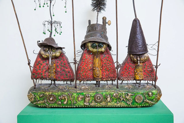 Rzeźby powstawały z najzwyklejszych przedmiotów. „Wścieklica”(1970) to stwór, który ma korpus wykonany z ręcznie kutej żelaznej klamki z zapadką, skrzydła z lemiesza, a dziób z zaworu silnika samochodowego. „Kopacz” (1970) straszy groźnymi czułkami z zagiętych wideł, jego nogi są z kółek, zaś bogato dekorowany betonowy odwłok, osadzony (został) na rusztowaniu z wygiętego drutu. „Sonda – Ślady czasu”(1977) to niby-ptak zbudowany z metalowych, spiralnie zwiniętych na końcach elementów połączonych ze sprzęgłem samochodowym (identyfikację zawdzięczam precyzyjnym opisom Katarzyny Winnickiej umieszczonym w katalogu zbiorów Muzeum Historycznego, Sanok 2007). Inne prace „zdobywają przestrzeń” dzięki wysuniętym w górę prętom, szczotkom czy frędzlom, uformowanym w fantastyczne kształty drutom, rozgałęziającym się jak korona rozrośniętego drzewa. Postacie „Trzech muszkieterów”(1970) to skrzaty z bajki w dziwacznych hełmach zdobionych drucianymi pióropuszami; dzierżą one długaśne lance. „Gościniec” (1975) jest stworem zamkniętym w owal starej podkowy, z niby-nóżkami (z których na dodatek zwisają szczotki) i ogonem z łańcucha zakończonym ostrym szpikulcem. „Szara mysz”(1965) i „Szuja” (1966) jeżą się groźnie wystawiając wysoko druciane grzywy.