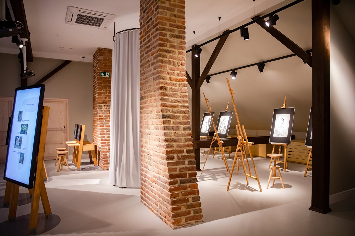 I w końcu to, co najbardziej atrakcyjne w pięknych wnętrzach poddasza – płynna granica, jaką można przekroczyć od obrazów Karpińskiego do świata pracowni artystycznej, która jest wyposażona w najnowocześniejsze multimedialne sztalugi i pędzle multimedialne, gdzie możemy się uczyć, czym jest kompozycja, kolor, gdzie możemy malować obrazy i natychmiast przesyłać je na maila albo do mediów społecznościowych. Jednocześnie wystarczy odwrócić głowę i za plecami mamy najpiękniejsze prace młodopolskiego artysty. Komu marzą się tradycyjne sztalugi też takie znajdzie, do tego podest dla modeli i zajęcia w ramach Szkoły Rysunku i Malarstwa. Na gości czeka jeszcze niewielkie kino, gdzie obecnie prezentowany jest film z życia i twórczości Alfonsa Karpińskiego, ale w przyszłości nie zabraknie projekcji artystycznych dokumentów. Będą też wykłady o sztuce.
