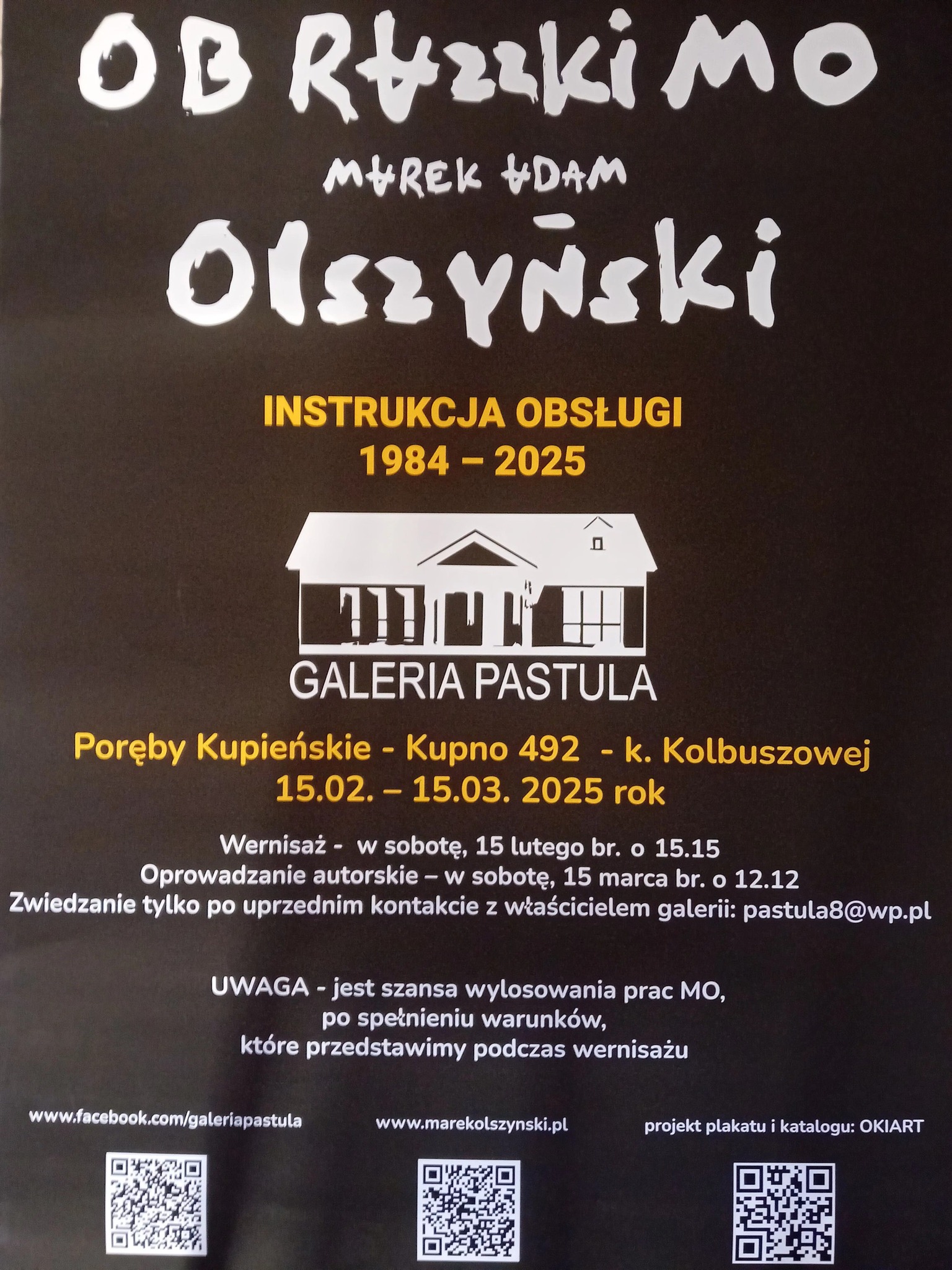 Niechże już będzie sobota, 15 lutego, godzina 15.15 – Galeria Pastula Janka Pastuły w Porębach Kupieński z przytupem wchodzi w 2025 rok i zaprasza na wernisaż wystawy „Instrukcja Obsługi” prof. Marka Olszyńskiego. A jak obiecuje bohater wieczoru: „Ma być podłe wino, smalec z jabłkami, ciepłe kartofle, >>śmietanka<< z Podkarpacia i nawet kilka MObrazzków można będzie wylosować”.