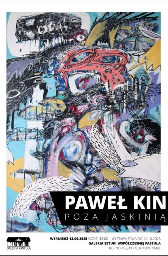 Paweł Kin mówi o sobie: „Wiodącym językiem moich obrazów jest ekspresjonizm abstrakcyjny, w którym często osadzam elementy Street Art i komiksu. Nierozłączną ich cechą jest dialog plamy z kreską, który opatrzony tytułem daje możliwość dalszej, indywidualnej interpretacji moich prac”. Sobotni wernisaż „Poza jaskinią” jest zaproszeniem do świata artysty, który w 1972 roku urodził się w Nowej Dębie.