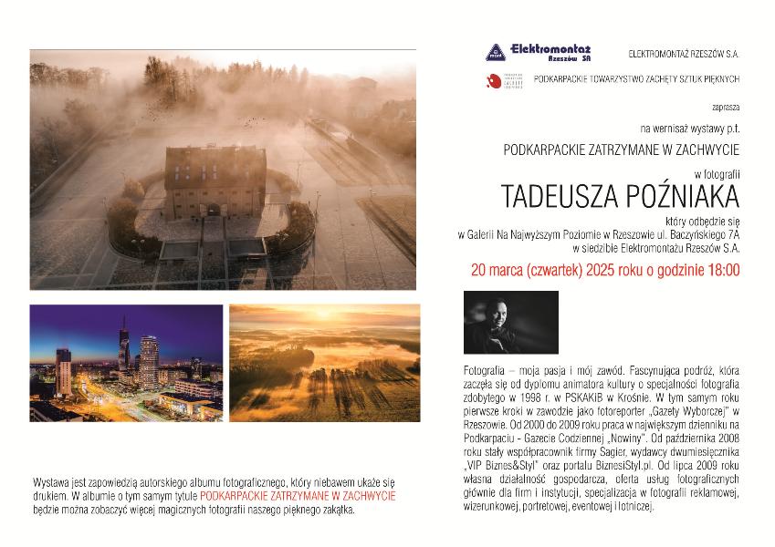 Wystawa fotografii znakomitego rzeszowskiego fotografa, Tadeusza Poźniaka już 20 marca o godz. 18.00 w Galerii na Najwyższym Poziomie – Elektromontaż w Rzeszowie. Wernisaż „Podkarpackie zatrzymane w zachwycie” to zapowiedź autorskiego albumu fotografa, który za kilka tygodni ukaże się pod tym samym tytułem. Dokumentacja najpiękniejszych zakątków naszego regionu – zachwycających przyrodniczo, wzruszających swoją historią, urzekających o różnych porach dnia i roku, różnorodnych, widzianych z ziemi i powietrza, ukazujących surowe, albo wręcz bajkowe oblicze Podkarpacia.
