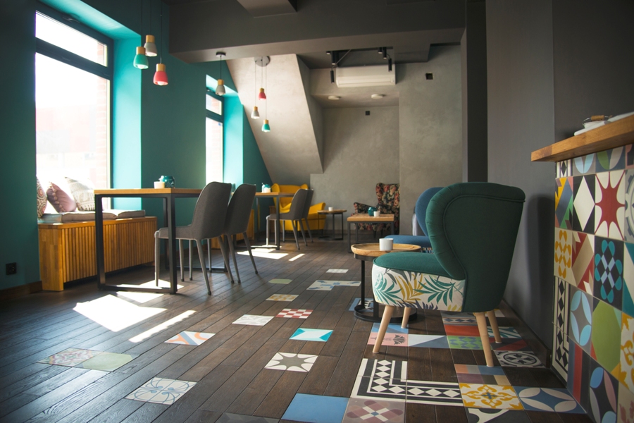 Kino za Rogiem urządzone jest w stylu nowoczesnym, ale jednocześnie przytulnym. Intensywną szarość na ścianach przełamują duże, barwne fotele i poduszki ułożone na sofach. Od wejścia w oczy rzucają się oryginalne kafle, które przyjechały do Rzeszowa z Mazowsza.