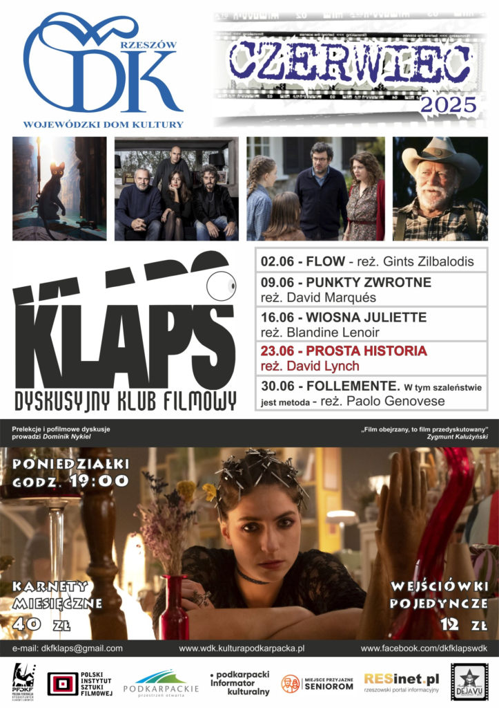 02.06.2025 r. – FLOW, reż. Gints Zilbalodis 09.06.2025 r. – PUNKTY ZWROTNE, reż. David Marqués 16.06.2025 r. – WIOSNA JULIETTE, reż. Blandine Lenoir 23.06.2025 r. – PROSTA HISTORIA, reż. David Lynch 30.06.2025 r. – FOLLEMENTE. W tym szaleństwie jest metoda, reż. Paolo Genovese – projekcja przedpremierowa Karnety miesięczne na pięć filmów będą dostępne w kasie biletowej WDK w cenie 40 zł a wejściówki pojedyncze na każdy film w cenie 12 zł -dostępne również na stronie: https://bilety.kulturapodkarpacka.pl