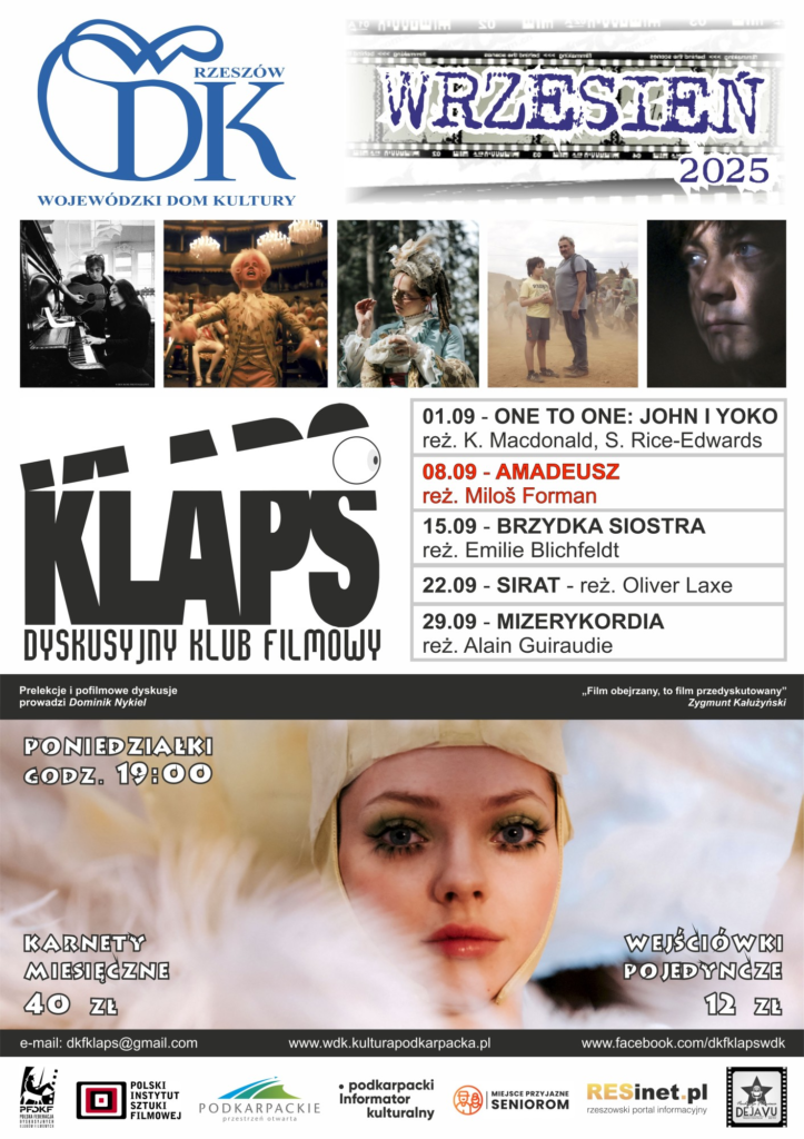 Dyskusyjny Klub Filmowy „Klaps” działający w Wojewódzkim Domu Kultury w Rzeszowie zaprasza we wrześniu (po wakacyjnej przerwie) na projekcje filmowe połączone z prelekcjami i pofilmowymi dyskusjami.