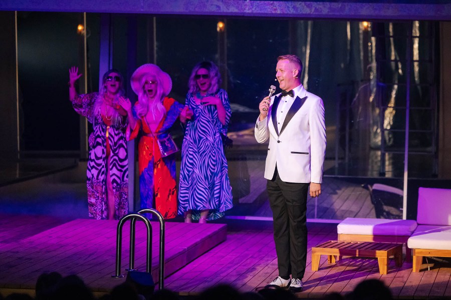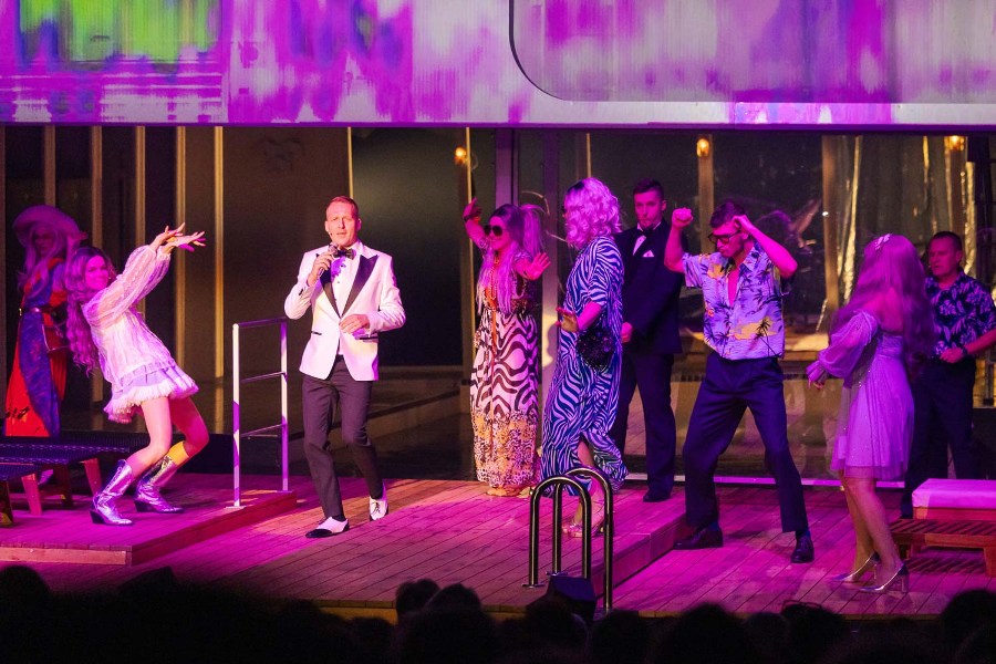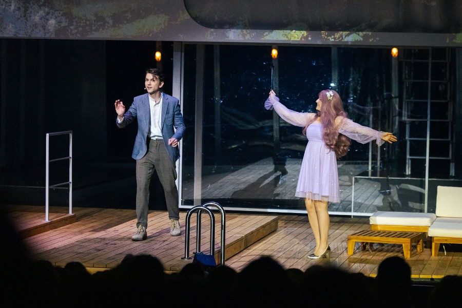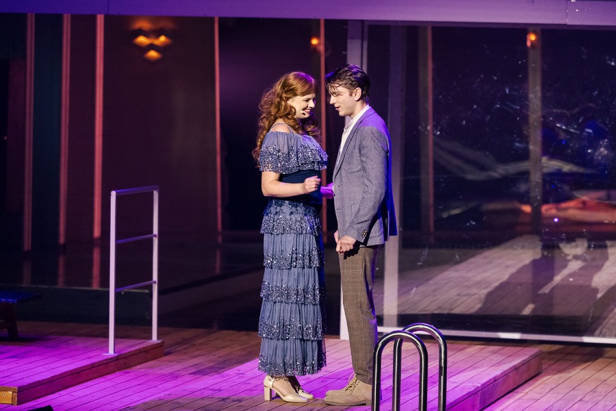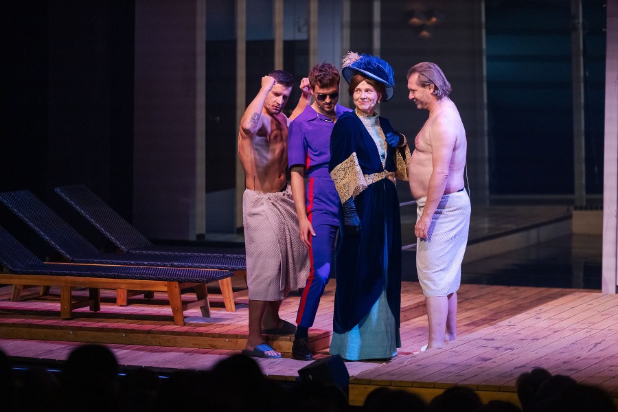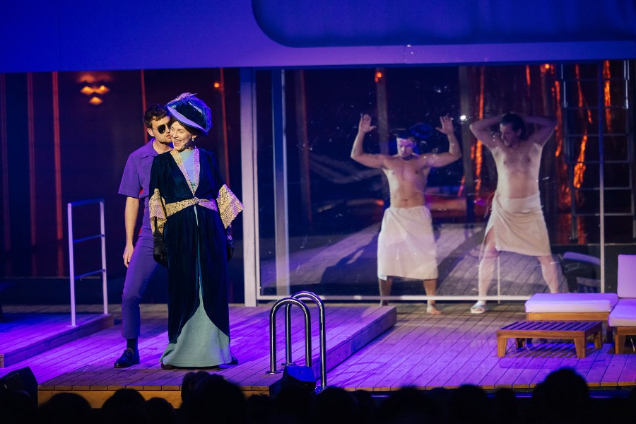 W przestrzeni przypominającej pokład liniowca toczy się akcja spektaklu. Z balkonami, wygodnymi kabinami i leżakami przy basenie. Wszystko to nawiązuje do przedwojennego blichtru najsłynniejszego statku, który zatonął podczas dziewiczego rejsu 15 kwietnia 1912 roku. Wspaniałe futra, misterne suknie, smokingi, cekiny i peruki – piękne kostiumy przypominają o setkach zamożnych pasażerów „Titanica’, spośród których najwięcej też ocaliło życie pod zderzeniu transatlantyku z górą lodową. I gdy w zawrotnym tempie pojawiają się i znikają na scenie: miliarder ze swymi kochankami, znudzona bogaczka z uroczym żigolakiem, czy zblazowany, nieprzyzwoicie bogaty przyszły mąż Rose, jest w tym współczesna tragifarsa. Jakże to bliskie dobrze nam znanej kreacji idealnego życia w mediach społecznościowych – nierealnego i zafałszowanego zarazem.