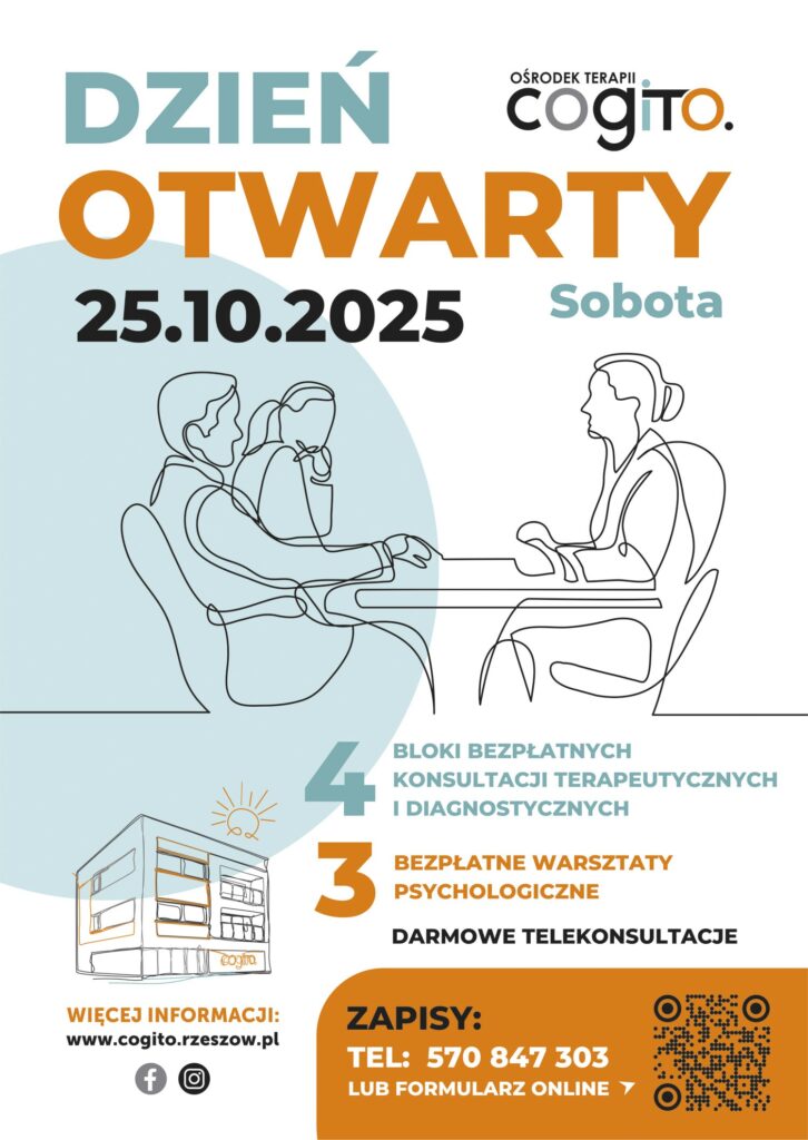 Już 25 października 2025 r. Ośrodek Terapii Cogito w Rzeszowie otworzy swoje drzwi dla wszystkich zainteresowanych zdrowiem psychicznym i dobrostanem emocjonalnym – swoim oraz najbliższych. To wyjątkowa okazja, aby spotkać się z naszymi specjalistami, poznać metody pracy i wziąć udział w warsztatach. Wsparcie w ramach dnia otwartego jest całkowicie bezpłatne.