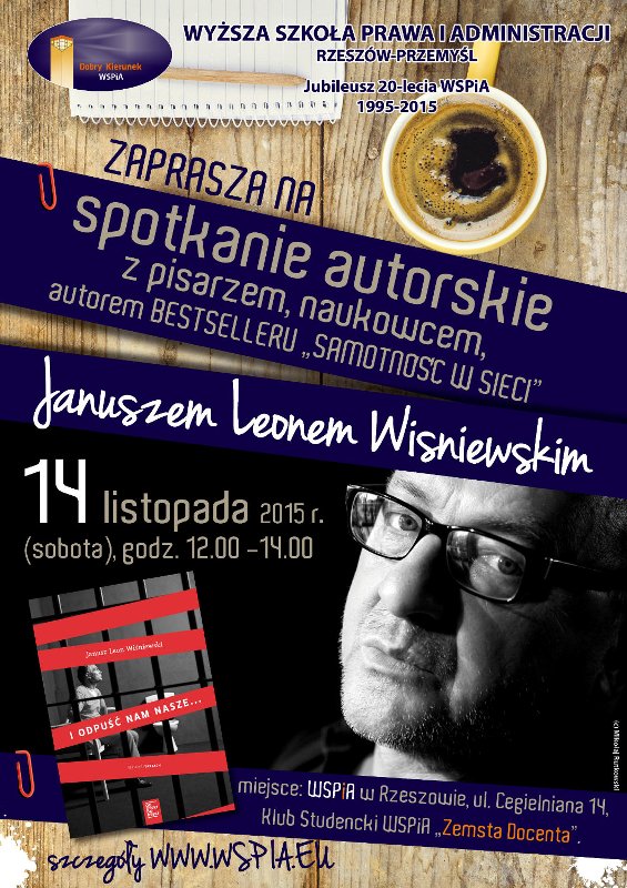 W sobotę, 14 listopada o godz. 12 WSPiA zaprasza na spotkanie z pisarzem i naukowcem – Januszem Leonem Wiśniewskim, autorem m.in. „S@motności w sieci” czy „I odpuść nam nasze…”. Będzie to kolejne spotkanie z cyklu Wykładów Otwartych z okazji jubileuszu 20-lecia uczelni.
