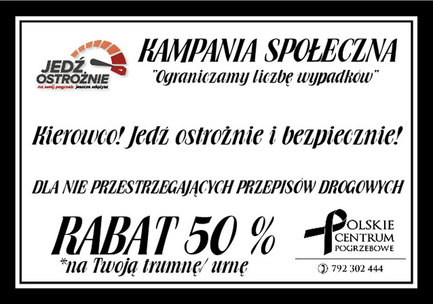 „Jedź ostrożnie – na swój pogrzeb jeszcze zdążysz – ograniczamy liczbę wypadków’’ – pod takim hasłem rusza w Rzeszowie kampania społeczna, której głównym celem będzie ostrzeganie kierowców przed szybką i brawurową jazdą. Adresatem organizowanej przez Fundację Artis akcji mają być pasażerowie, rodzice i dzieci, instytucje i firmy komercyjne.