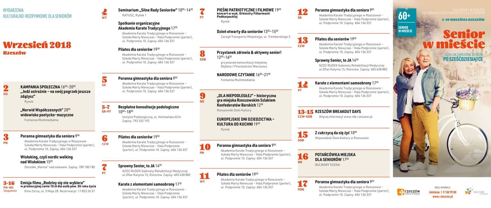 Od 2 września, przez 4 tygodnie seniorzy będą mogli wybierać spośród szerokiej oferty spotkań, które przybiorą formy m.in.; wykładów, warsztatów, lekcji pokazowych, spotkań tematycznych, spektakli teatralnych czy konsultacji zdrowotnych. Nie zabraknie również czasu na aktywność fizyczną. Będzie można spróbować swoich sił z kijkami nordic walking, poznać podstawy karate z elementami samoobrony czy potańczyć na rzeszowskich bulwarach.