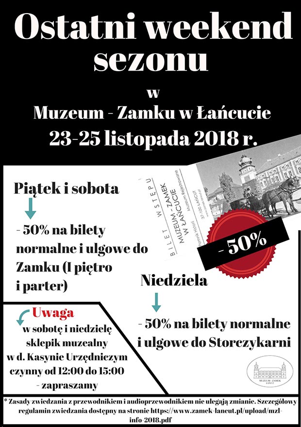 Na zakończenie sezonu turystycznego, w ostatni weekend listopada, Muzeum-Zamek w Łańcucie przygotował dla wszystkich zainteresowanych zwiedzaniem specjalną ofertę. Odwiedzający będą mogli kupić wybrane bilety z 50-procentowym rabatem. Weekendowa promocja dotyczy biletów normalnych i ulgowych.
