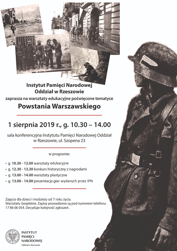 Tego samego dnia Instytut Pamięci Narodowej Oddział w Rzeszowie zaprasza na warsztaty edukacyjne poświęcone tematyce Powstania Warszawskiego. W ich programie jest konkurs historyczny z nagrodami, warsztaty plastyczne i prezentacja gier wydanych przez IPN. Wszystkie zajęcia odbędą się w budynku przy ul. Szopena 23 w godz. 10.30-14.00 i skierowane są dla dzieci i młodzieży od 7. roku życia. Warsztaty bezpłatne. Zapisy prowadzone pod numerem telefonu 17 86 06 054. Decyduje kolejność zgłoszeń.