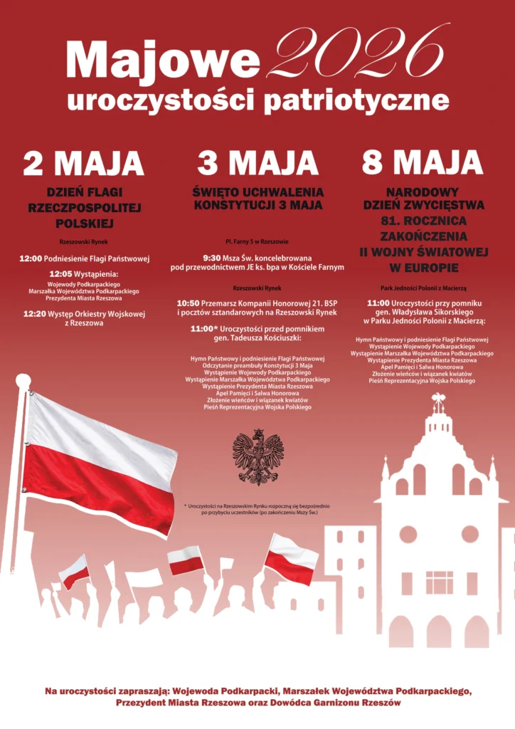 Uroczystości patriotyczne organizowane przy tej okazji w wielu miejscach pozwolą głębiej przeżyć wartość wolności i upamiętnić bohaterów. Wojewoda Podkarpacki, Marszałek Województwa Podkarpackiego, Prezydent Miasta Rzeszowa oraz Dowódca Garnizonu Rzeszów zapraszają na majowe uroczystości patriotyczne.