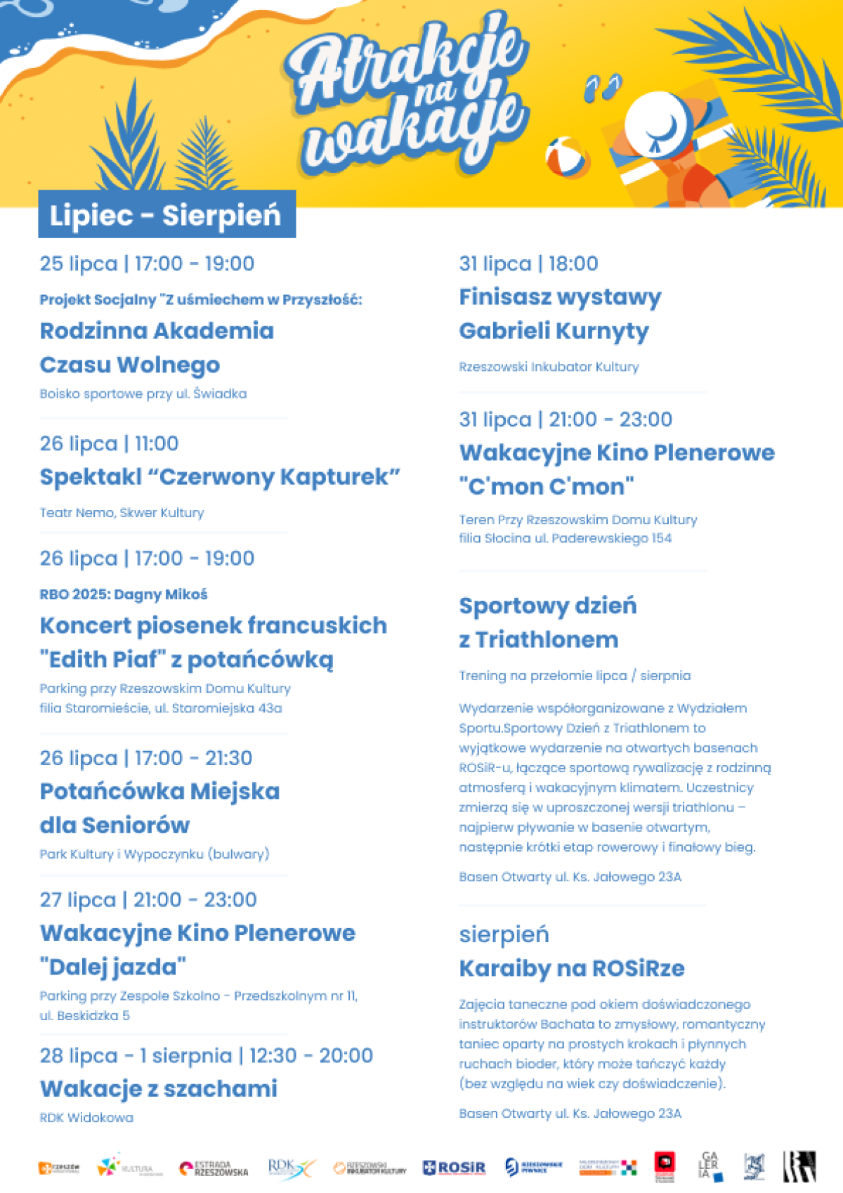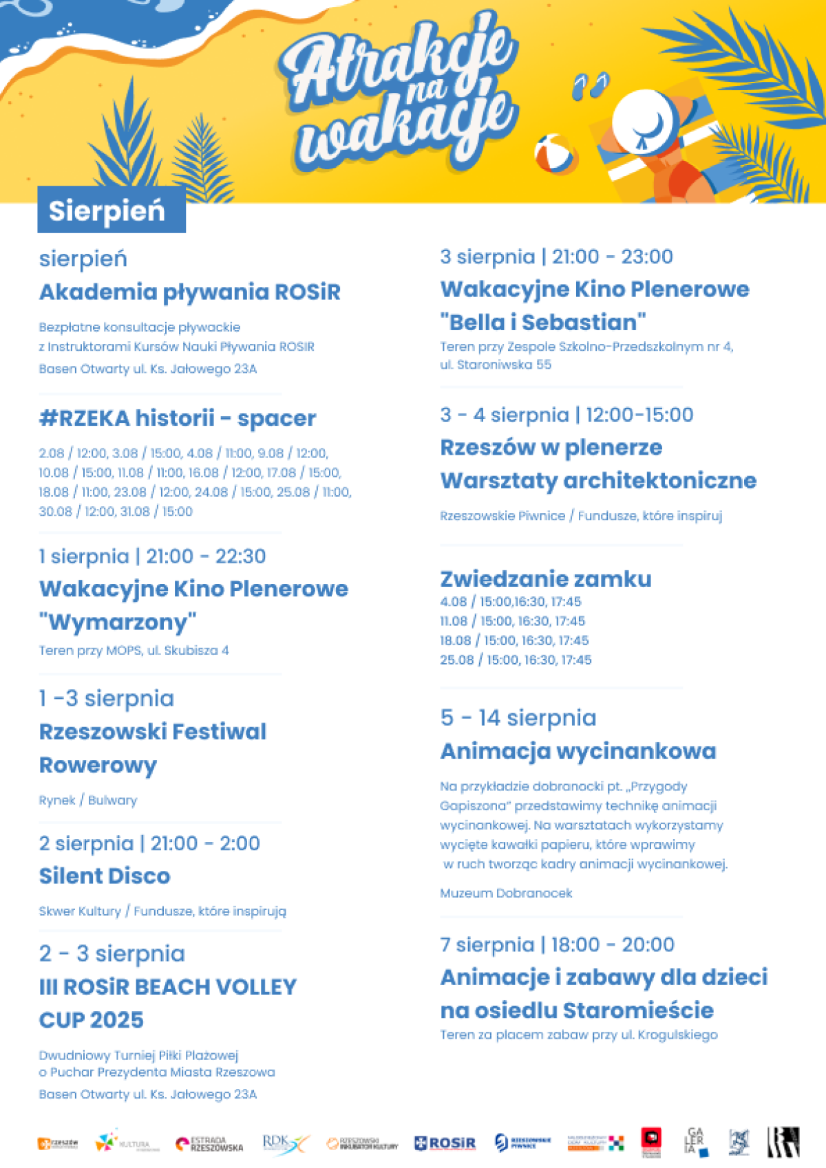 Kolejne atrakcje które przygotowaliśmy to m.in. „Karaiby na ROSiRze”, tańce i zabawy. O każdym z takich wydarzeń będziemy informować na bieżąco w mediach społecznościowych – zapowiedział Adrian Rudawski, Dyrektor Rzeszowskiego Ośrodka Sportu i Rekreacji. Miejski Wydział Sportu zaprasza m.in. na cykl 9 imprez sportowych, które organizuje wspólnie z klubami. – 1 -3 sierpnia Rzeszowski Festiwal Rowerowy, czyli największy festiwal rowerowy na Podkarpaciu, który łączy praktycznie każdą odmianę kolarstwa. Tydzień później 31. Rajd Rzeszowski. W sierpniu turniej w siatkówce plażowej oraz turniej w koszykówce 3X3 – poinformował Michał Solarski z Wydziału Sportu Urzędu Miasta Rzeszowa.