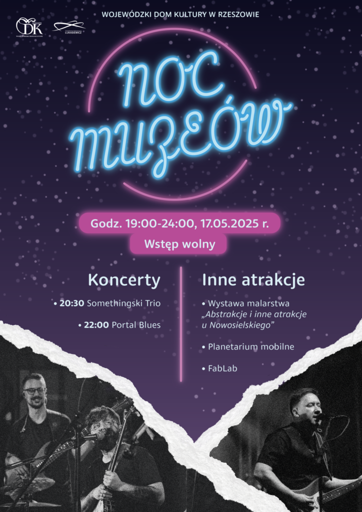 Pełną emocji Noc Muzeów szykuje Wojewódzki Dom Kultury w Rzeszowie. Gmach przy ul. Okrzei 7 zamieni się w przestrzeń pełną muzyki i kreatywnych przygód z nauką i sztuką. Plenerowy koncert pod gwiazdami zagra Somethingski Trio, a potem popłyną bluesowe evergreeny w wykonaniu Portal Blues. Będą kreatywne zajęcia, miecze świetlne i „płomienna” fala akustyczna, a nawet podróż w kosmos dzięki mobilnemu planetarium z Podkarpackiego Centrum Nauki „Łukasiewicz”. Zapraszamy w sobotę 17 maja, między 19.00 a 24.00. Zapraszamy! Wstęp wolny!