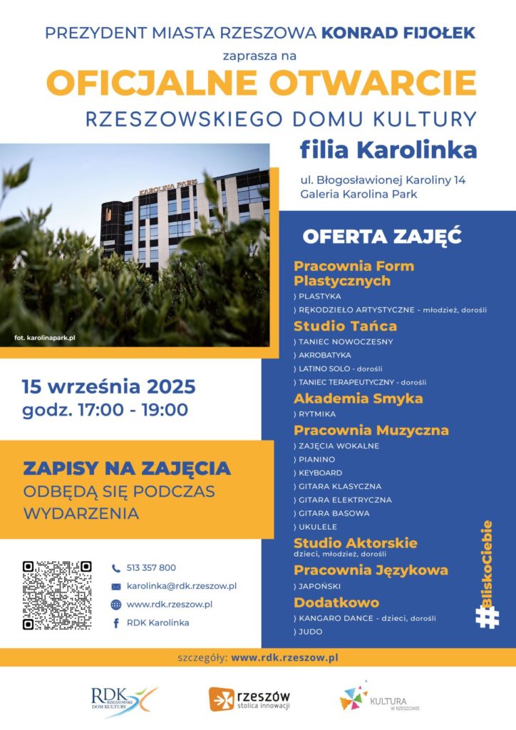 Prezydent Miasta Rzeszowa Konrad Fijołek zaprasza na oficjalne otwarcie filii Karolinka połączone z rekrutacją na zajęcia już w poniedziałek 15 września 2025 roku o godzinie 17:00 do Galerii Karolina Park przy ul. Błogosławionej Karoliny 14. Szczegółowe informacje na temat zajęć w nowej filii RDK można uzyskać pod numerem telefonu 513 357 800 lub wysyłając maila na adres karolinka@rdk.rzeszow.pl