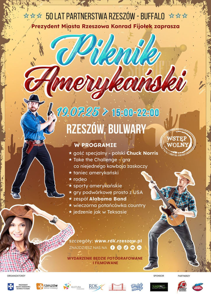 Prezydent Miasta Rzeszowa Konrad Fijołek oraz Rzeszowski Dom Kultury po raz trzeci zapraszają mieszkańców na Piknik Amerykański. Wydarzenie odbędzie się w sobotę 19 lipca 2025 roku i tradycyjnie już będzie miało miejsce w Parku Kultury i Wypoczynku w Rzeszowie na miejskich bulwarach. Na wszystkich przybyłych czekać będzie mnóstwo atrakcji inspirowanych barwną kulturą Stanów Zjednoczonych. Udział w wydarzeniu jest bezpłatny.