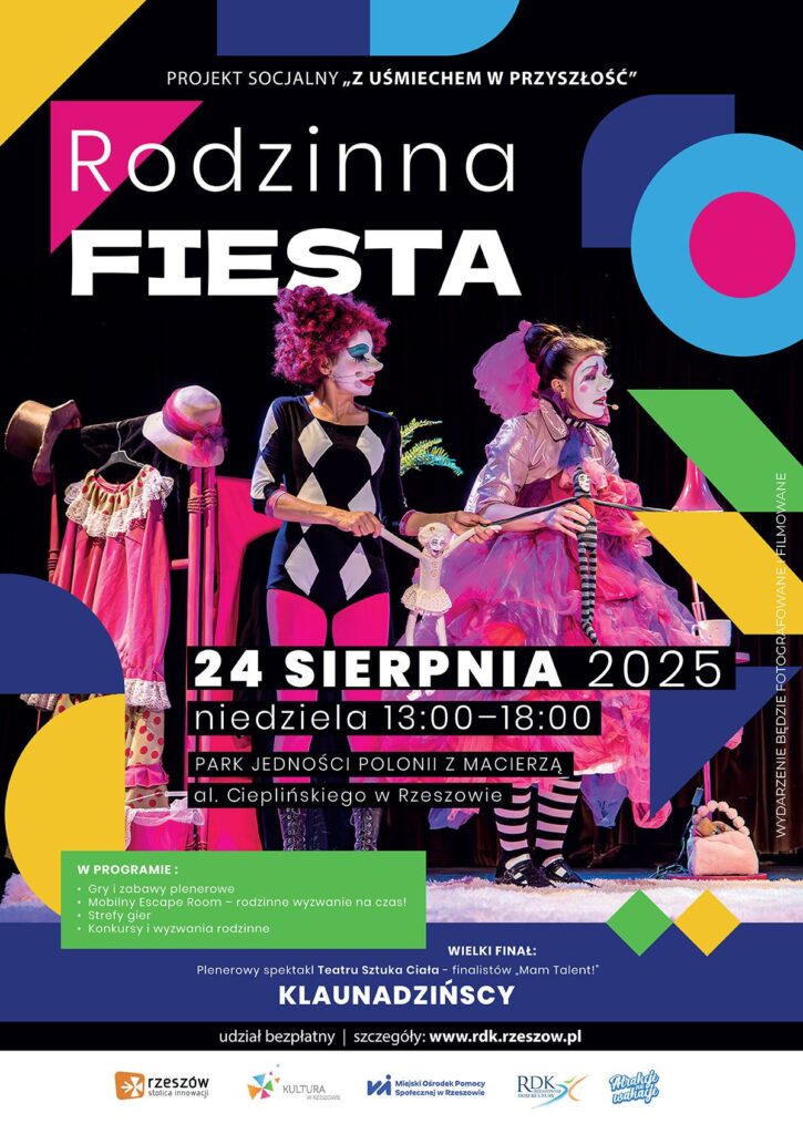 W niedzielę 24 sierpnia 2025 roku w godzinach 13:00 – 18:00 Park Jedności Polonii z Macierzą przy al. Cieplińskiego w Rzeszowie zamieni się w krainę radości, śmiechu i wspólnej zabawy. Emocji dostarczy mobilny escape room, w którym rozegra się rodzinna rywalizacja na czas. Konkursy, gry i zabawy plenerowe wypełnią dalszy program, a na zakończenie wystąpi Teatr Sztuka Ciała – finalista programu „Mam Talent!”. Aktorzy zaprezentują pełne emocji, ale jednocześnie bardzo zabawne widowisko pt. „Klaunadzińscy”, odpowiednie dla widzów w każdym wieku.