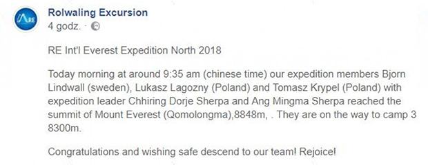 Informację o zdobyciu szczytu przekazała rano agencja organizująca wejście. Łukasz Łagożny, Tomasz Krypel, Szwed Bjorn Lindwall oraz dwóch Szerpów weszli na Mount Everest około 9:35 czasu chińskiego, czyli ok. 3:35 nad ranem. Po zdobyciu szczytu, himalaiści rozpoczęli zejście do obozu III – na wysokości 8 300 m n.p.m.