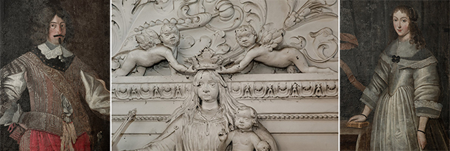 Sztukaterie w Krośnie stanowią eleganckie ramy dla rodowych portretów. Nad każdym z nich umieszczono bogate tarcze herbowe. Wyżej widnieje fryz z panopliów – tak aktualny w pełnej wojen epoce. Oglądamy na fryzie armaty spoczywające na lawetach, kule, beczki z prochem – na wojskowych bębnach skończywszy. To aluzja do „rycerskich przewag” Stanisława.