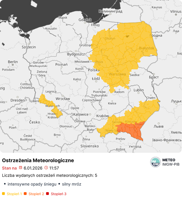 woj. podlaskie, mazowieckie, warmińsko-mazurskie (częściowo), wschodnie powiaty łódzkiego i kujawsko-pomorskiego: stopień 1, ważne do godz. 09:00 dnia 7.01.2026. Wystąpienie silnego mrozu będzie silnie uzależnione od zasięgu i czasu występowania rozpogodzeń w ciągu nocy. W związku z dużą niepewnością prognoz zachmurzenia – możliwe są modyfikacje zasięgu występowania silnego mrozu;
