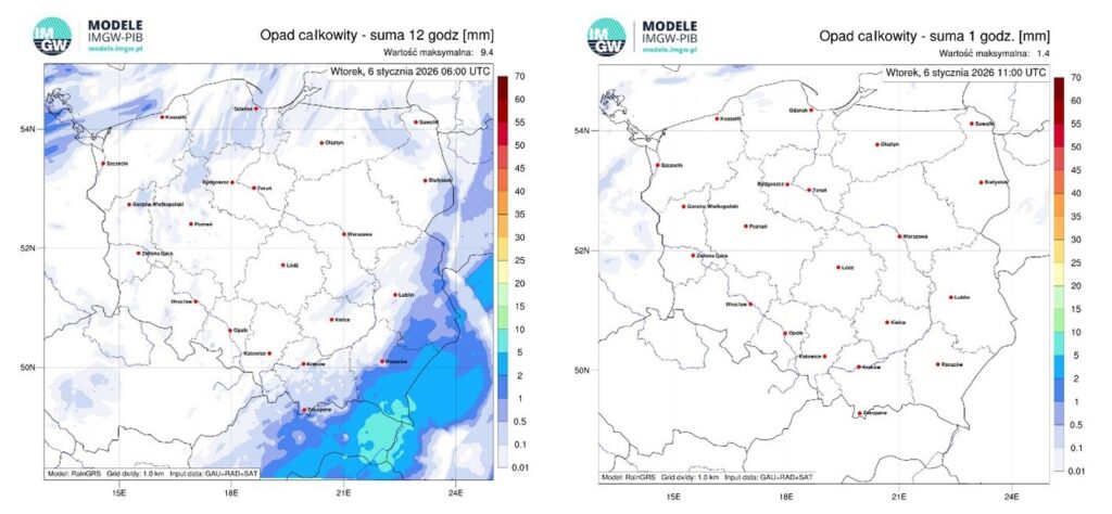 Rys. 3 Pole opadu atmosferycznego systemu RainGRS, oparty o pomiary radarowe, w połączeniu z siecią stacji pomiarowych i danych satelitarnych, w agregacji za okres nocy 5/6.01, od godz. 19:00 do godz. 7:00 (z lewej) oraz z ostatniej godziny, od godz. 11:00 do godz. 12:00 dnia 6.01 (z prawej).