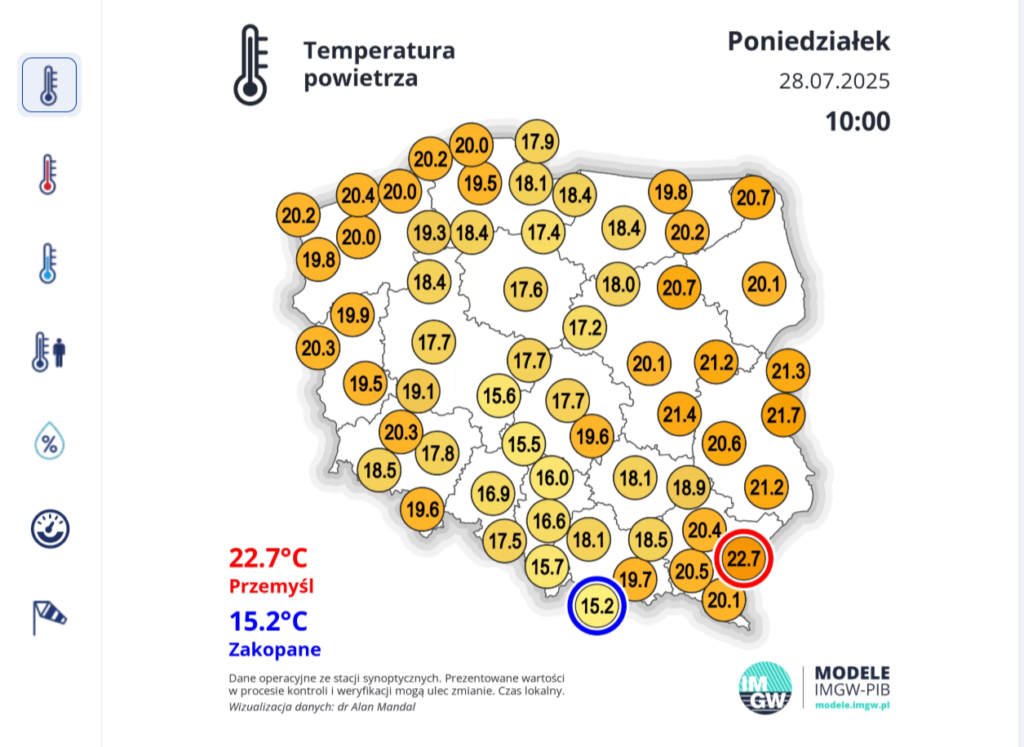 W dzień zachmurzenie duże i całkowite. Miejscami opady deszczu i burze. Opady okresami o umiarkowanym i silnym natężeniu. Suma opadów na południu i wschodzie do około 30 mm, w centrum i na północy do 50 mm. Temperatura maksymalna od 17°C miejscami w centrum i na północy, 20°C, 23°C na przeważającym obszarze, do 25°C na wschodzie; na Podhalu około 16°C. Wiatr umiarkowany, nad morzem chwilami także dość silny, w całym kraju okresami porywisty, nad morzem do 60 km/h, na zachodzie głównie północno-zachodni i zachodni, na wschodzie z kierunków południowych. W czasie burz porywy wiatru do około 70 km/h.