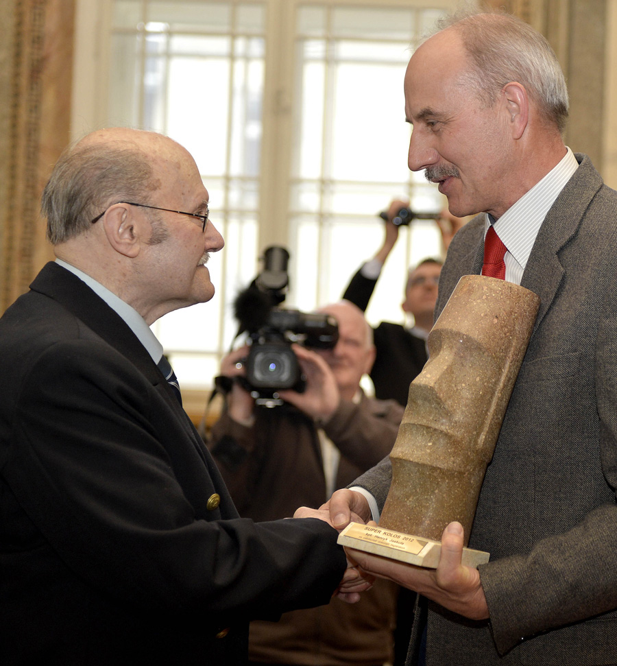 Himalaista Leszek Cichy, członek kapituły Kolosów, wręcza Super Kolosa kapitanowi Henrykowi Jaskule podczas uroczystości w Przemyślu (fot. D. Delmanowicz)