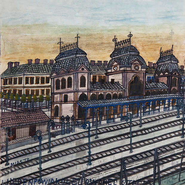 Reprezentacyjne dworce we Lwowie i Przemyślu (podpisanym: „PRZEMYSŁ”) zwracają uwagę dbałością o precyzyjne odtworzenie fasad budowli łącznie z detalem architektonicznym. Małomiasteczkowy dworzec w Krośnie ma również charakter studium z natury. Kłopoty sprawia widok dworca wiedeńskiego. Czyżby Nikifor zapuścił się aż tak daleko? Wyjaśnienie pośrednio przynosi ilustracja o zupełnie innym charakterze. Przedstawia ona dwóch starszych panów we frakach. Pod spodem napis: „ACCORD-FRANCO-ALLMAN”. Nie znaczy to, iż artysta znał francuski, skoro niezbyt dobrze władał polskim. Po prostu skopiował ilustrację dotyczącą podpisania jakiegoś porozumienia francusko-niemieckiego tak, jak posłużył się fotograficznym widokiem dworca wiedeńskiego.